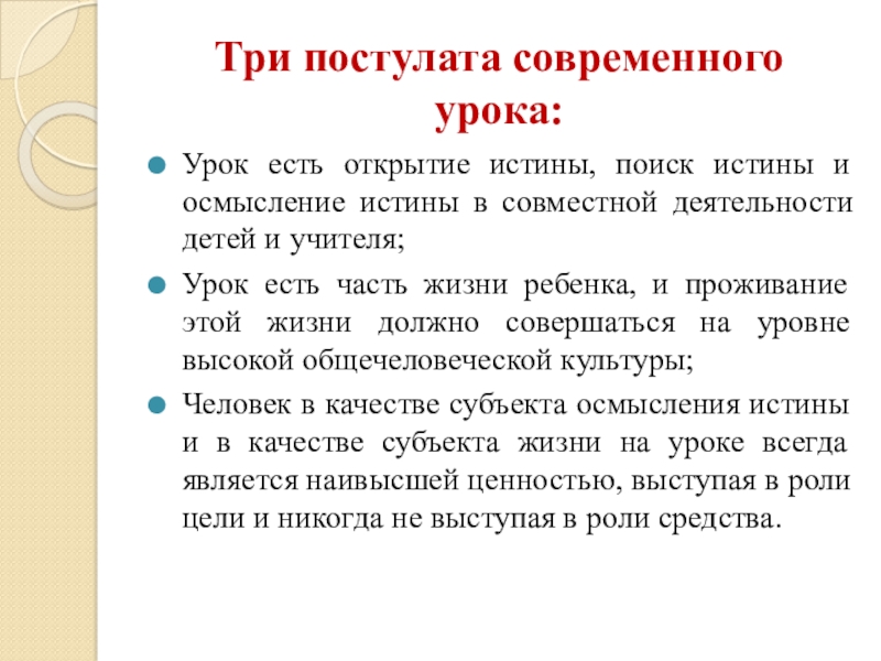 Человек в качестве субъекта осмысления истины и в качестве субъекта жизни на уроке всегда является наивысшей ценностью, выступая в роли цели и никогда не выступая в роли средства.