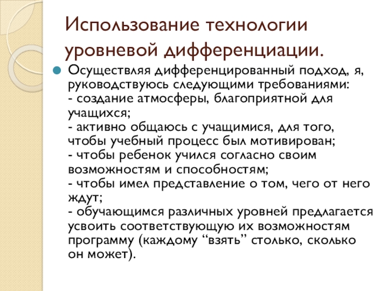 - обучающимся различных уровней предлагается усвоить соответствующую их возможностям программу (каждому “взять” столько, сколько он может).