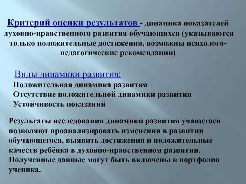 Результаты исследования динамики развития учащегося позволяют проанализировать изменения в развитии обучающегося, выявить достижения и положительные качеств ребёнка в духовно-нравственном развитии. Полученные данные могут быть включены в портфолио ученика.