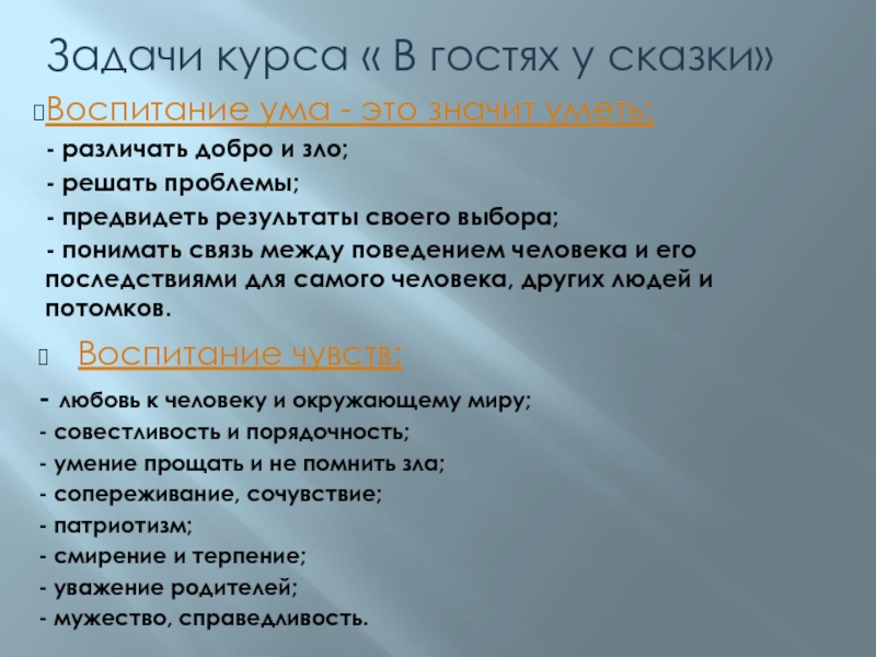 Слайд 22Задачи курса « В гостях у сказки»