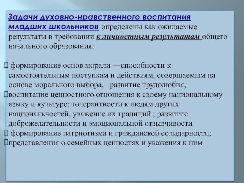 Слайд 8Задачи духовно-нравственного воспитания младших школьников определены как ожидаемые результаты в требовании к