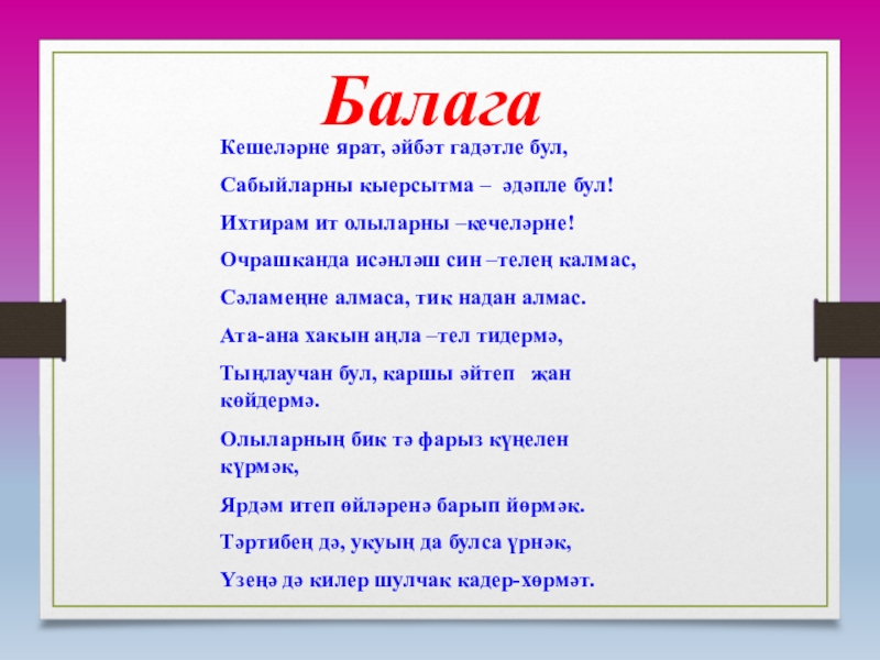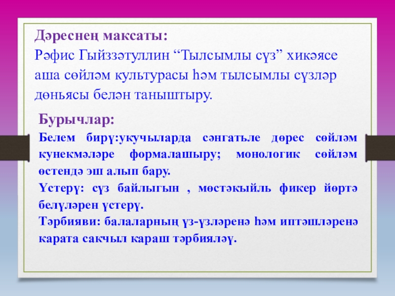 Белем бирү:укучыларда сәнгатьле дөрес сөйләм кунекмәләре формалашыру; монологик сөйләм өстендә эш алып бару.
