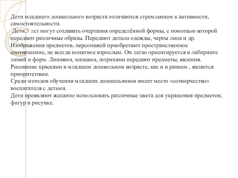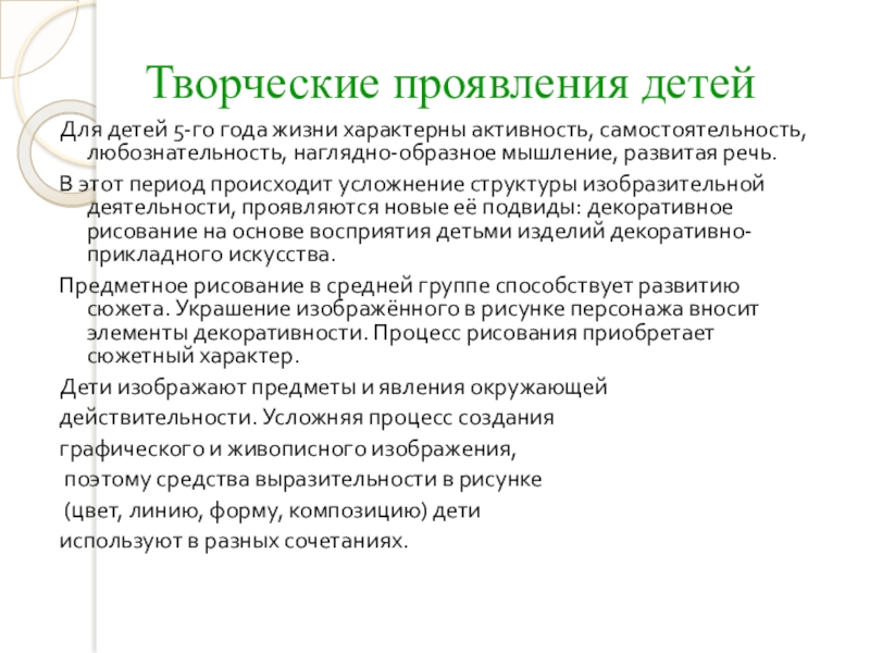 жизни)значительно богаче по средствам изображения и содержанию, чем в предшествующих возрастах. В этом возрасте у детей особенно ярко появляется тенденция к самовыражению, самоутверждению. Стремление к созданию новых композиций является основой изобразительного творчества старших дошкольников.
