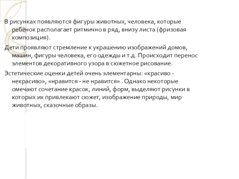 Дети проявляют стремление к украшению изображений домов, машин, фигуры человека, его одежды и т.д. Происходит перенос элементов декоративного узора в сюжетное рисование.