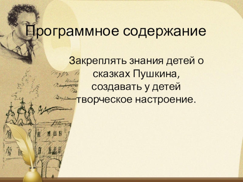 Программное содержаниеЗакреплять знания детей о сказках Пушкина, создавать у детей творческое настроение.