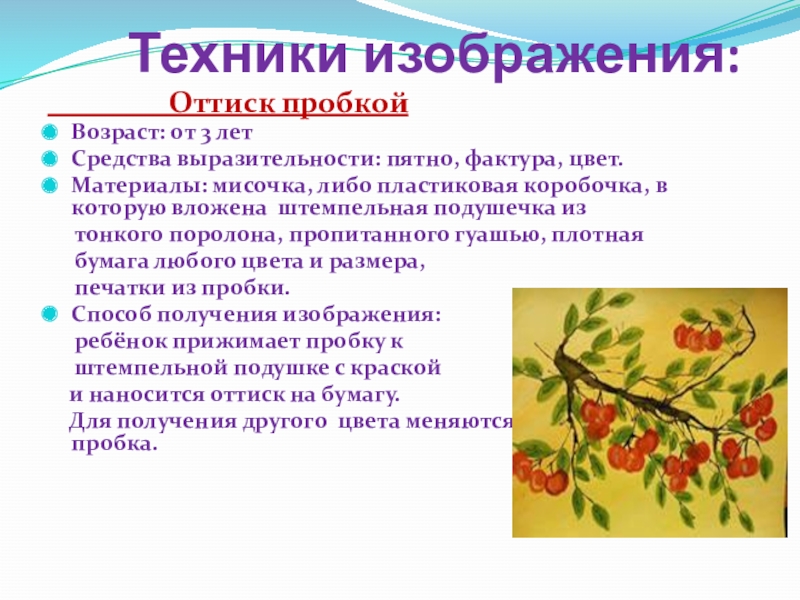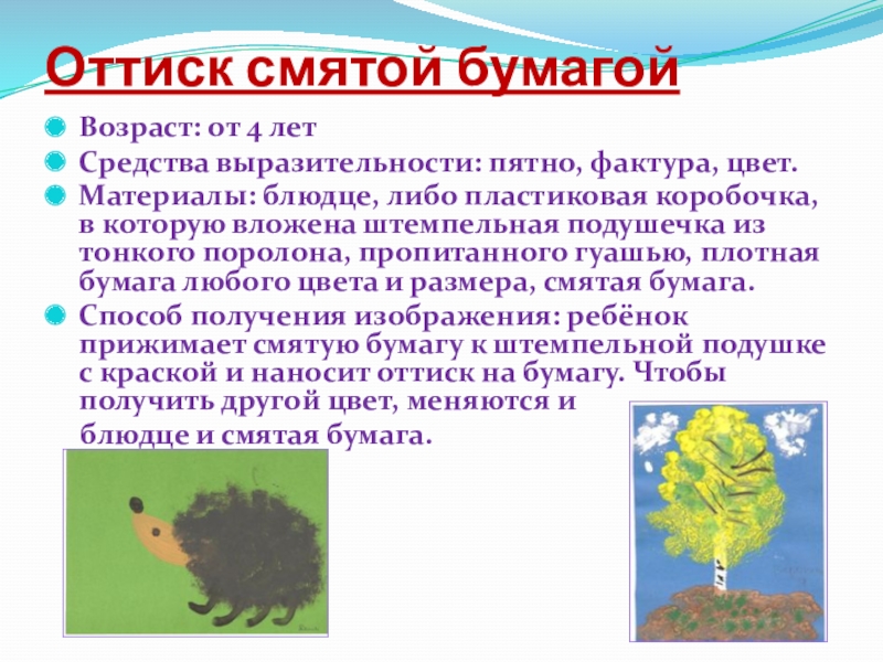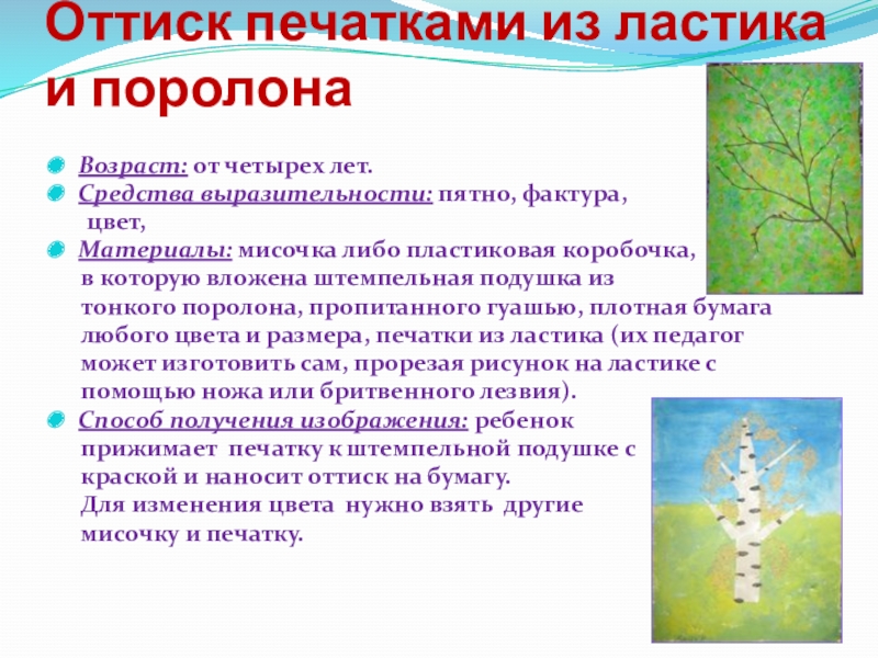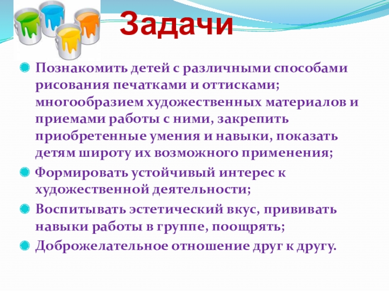 Познакомить детей с различными способами рисования печатками и оттисками; многообразием художественных материалов и приемами работы с ними, закрепить приобретенные умения и навыки, показать детям широту их возможного применения;