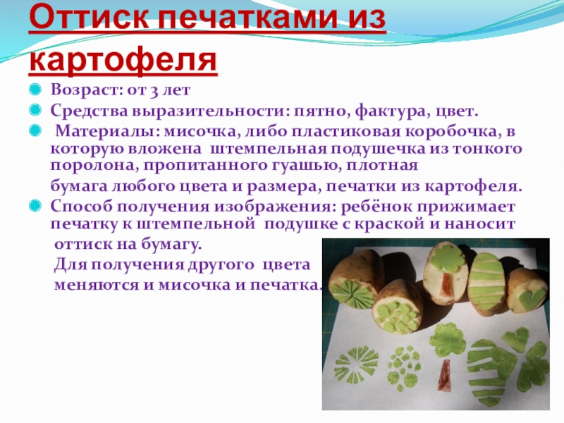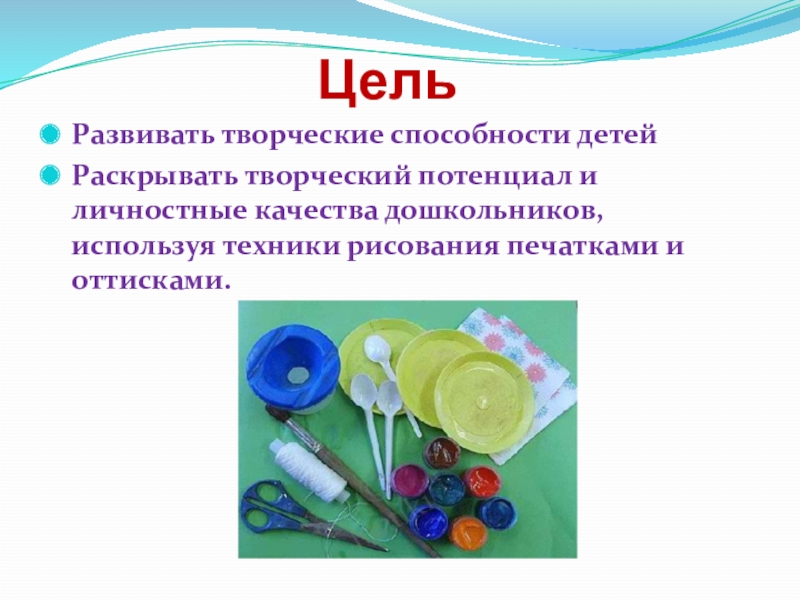 Раскрывать творческий потенциал и личностные качества дошкольников, используя техники рисования печатками и оттисками.