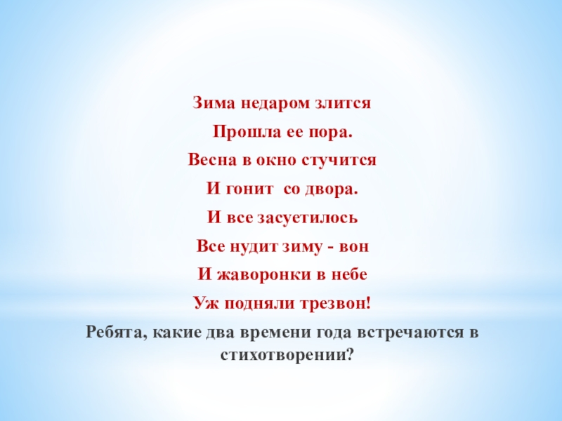 Зима недаром злитсяПрошла ее пора. Весна в окно стучитсяИ гонит со двора.И все засуетилось Все нудит зиму - вонИ жаворонки в небе Уж подняли трезвон!Ребята, какие два времени года встречаются в стихотворении?