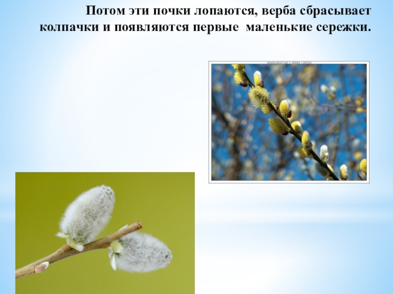 Слайд 5Потом эти почки лопаются, верба сбрасывает колпачки и появляются первые маленькие