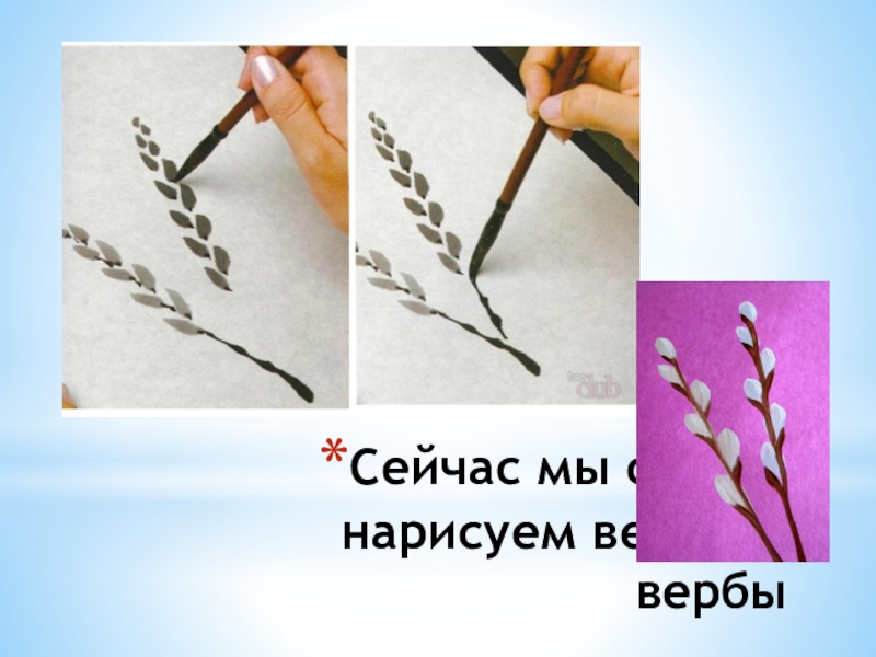 Слайд 7Сейчас мы с вами нарисуем веточки вербы