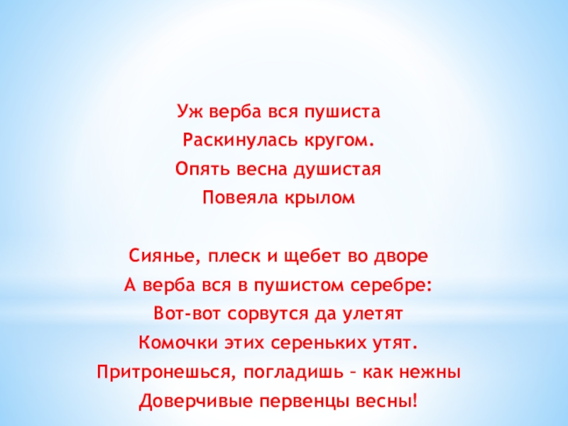 Уж верба вся пушистаРаскинулась кругом. Опять весна душистаяПовеяла крыломСиянье, плеск и щебет во двореА верба вся в