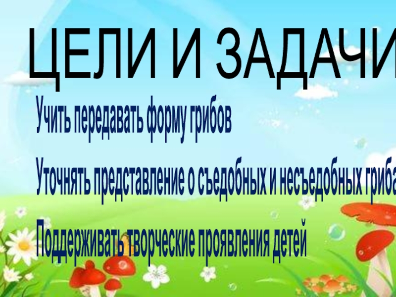 ЦЕЛИ И ЗАДАЧИ:Учить передавать форму грибовУточнять представление о съедобных и несъедобных грибахПоддерживать творческие проявления детей
