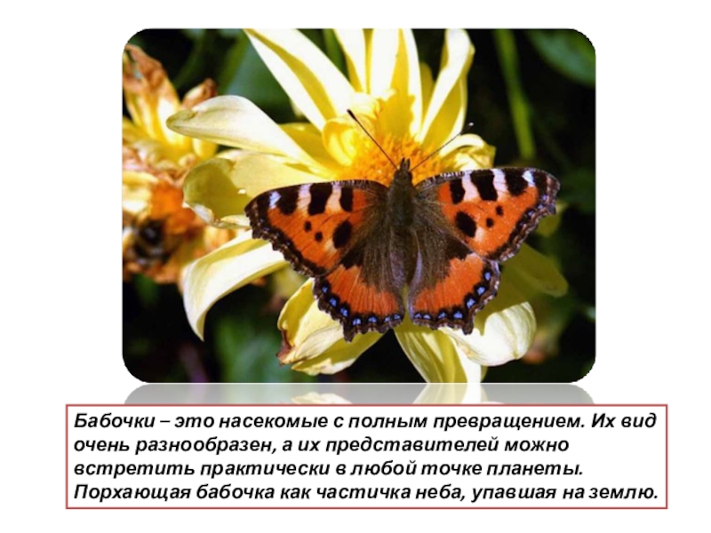 Слайд 3Бабочки – это насекомые с полным превращением. Их вид очень разнообразен,