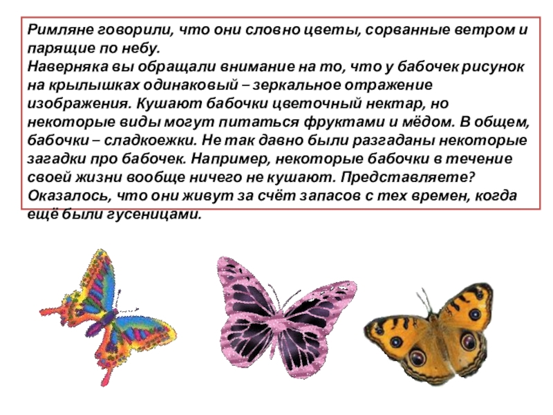 Наверняка вы обращали внимание на то, что у бабочек рисунок на крылышках одинаковый – зеркальное отражение изображения. Кушают бабочки цветочный нектар, но некоторые виды могут питаться фруктами и мёдом. В общем, бабочки – сладкоежки. Не так давно были разгаданы некоторые загадки про бабочек. Например, некоторые бабочки в течение своей жизни вообще ничего не кушают. Представляете? Оказалось, что они живут за счёт запасов с тех времен, когда ещё были гусеницами.