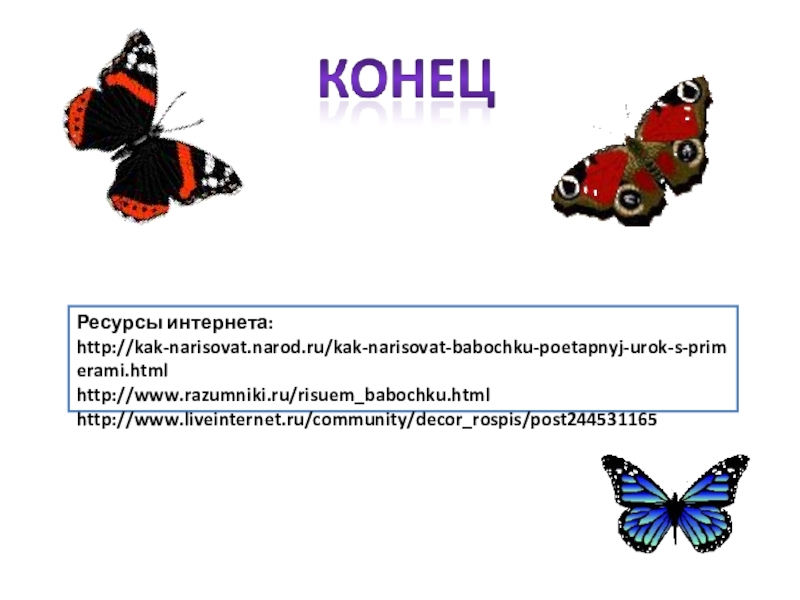 Слайд 34Ресурсы интернета: http://kak-narisovat.narod.ru/kak-narisovat-babochku-poetapnyj-urok-s-primerami.html