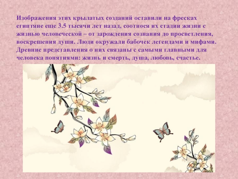 лет назад, соотнося их стадии жизни с жизнью человеческой – от зарождения сознания до просветления, воскрешения души. Люди окружали бабочек легендами и мифами. Древние представления о них связаны с самыми главными для человека понятиями: жизнь и смерть, душа, любовь, счастье.