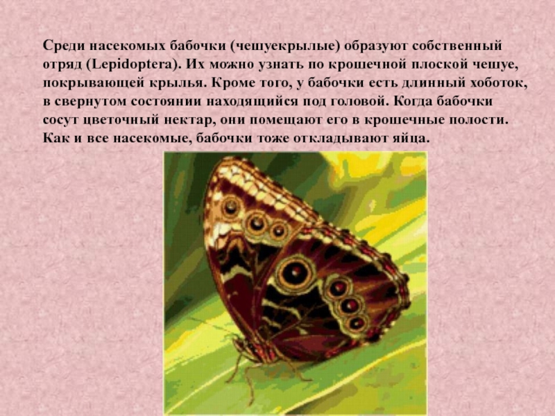 Слайд 2Среди насекомых бабочки (чешуекрылые) образуют собственный отряд (Lepidoptera). Их можно узнать