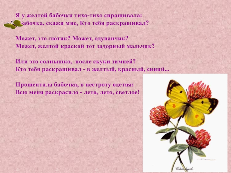 Я у желтой бабочки тихо-тихо спрашивала: Бабочка, скажи мне, Кто тебя раскрашивал?Может, это лютик? Может, одуванчик?Может, желтой