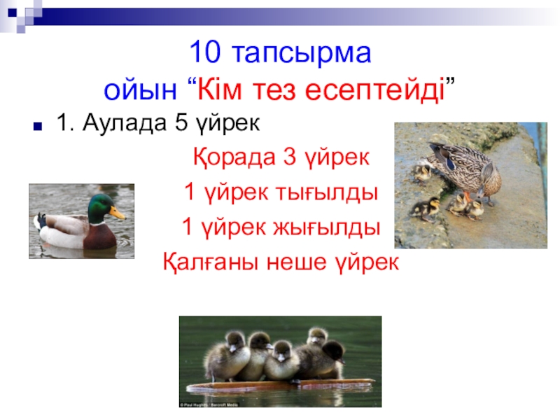 Танымдылық, шығармашылық, ойлау қабілеттерін дамыту. Есепті өз беттерімен ауызша, жазбаша шығаруға машықтандыру. Табиғатқа, құстарға қамқор болуға тәрбиелеу.