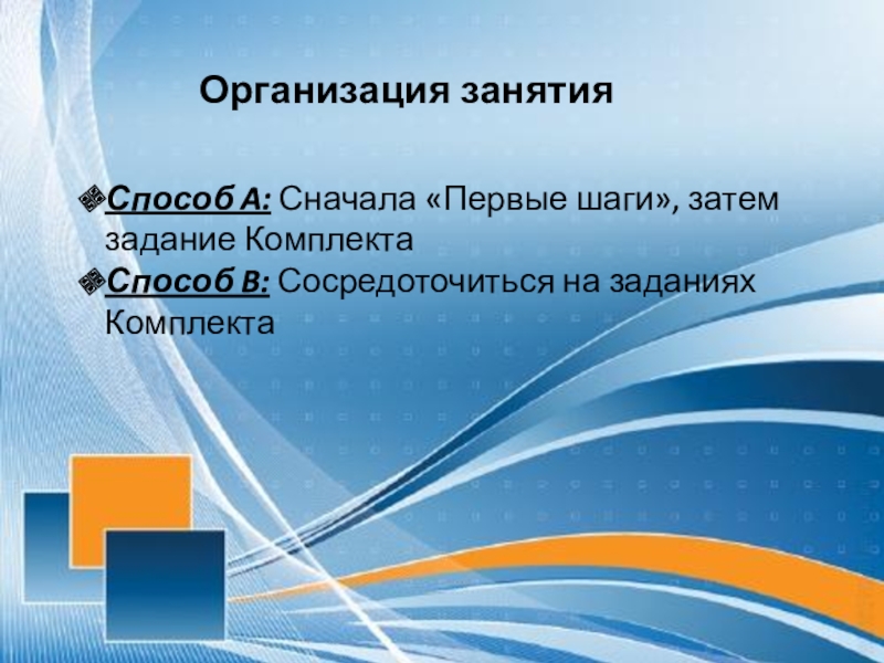 Организация занятияСпособ A: Сначала «Первые шаги», затем задание КомплектаСпособ B: Сосредоточиться на заданиях Комплекта