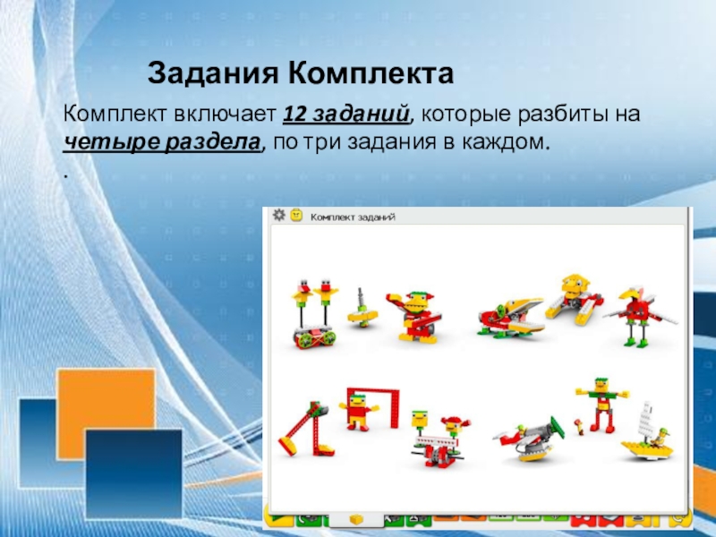 Комплект заданийКомплект содержит 12 заданий. Эти материалы можно загрузить в компьютер и использовать совместно с программным