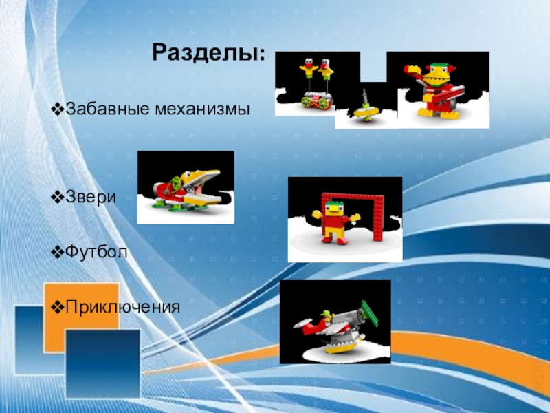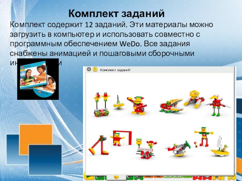 компьютер и использовать совместно с программным обеспечением WeDo. Все задания снабжены анимацией и пошаговыми сборочными инструкциями