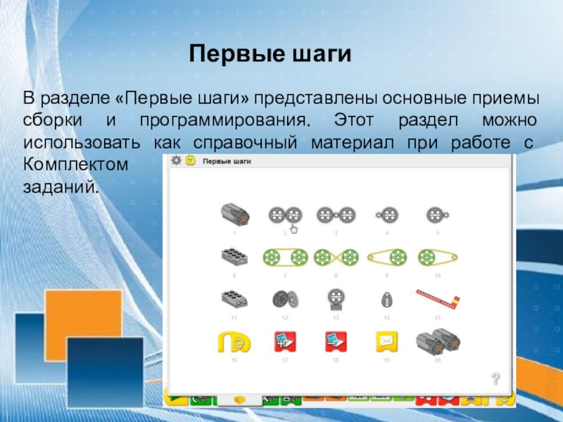 В разделе «Первые шаги» представлены основные приемы сборки и программирования.