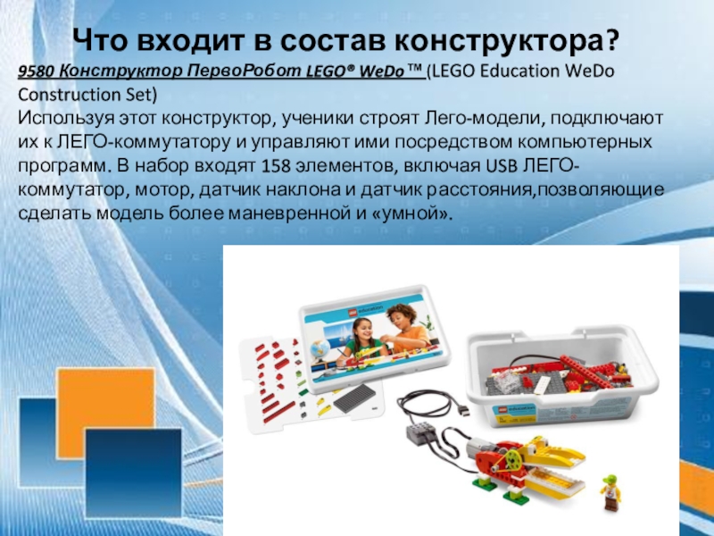 Что входит в состав конструктора?9580 Конструктор ПервоРобот LEGO® WeDo™ (LEGO Education WeDo Construction Set)Используя этот конструктор, ученики