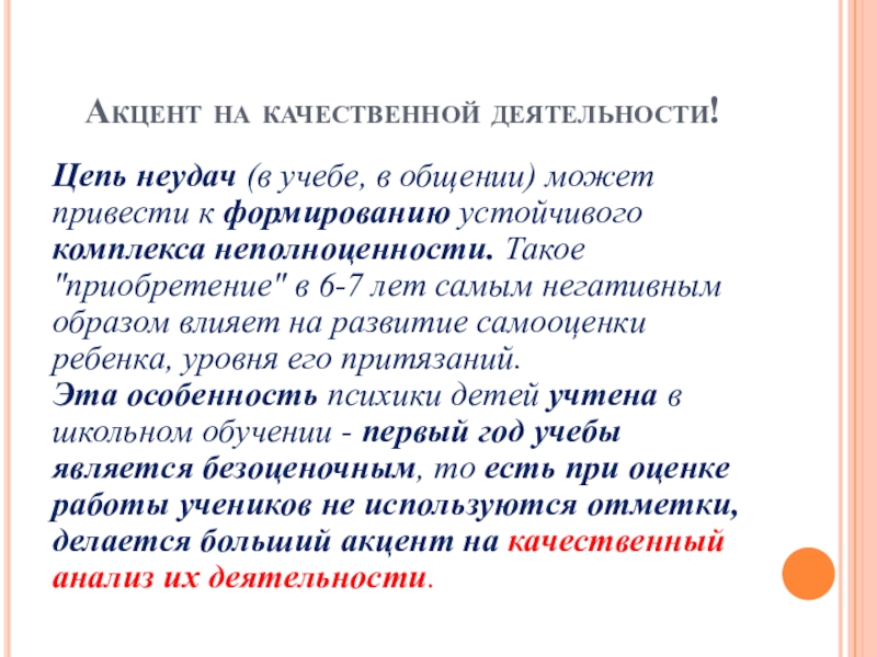 Эта особенность психики детей учтена в школьном обучении - первый год учебы является безоценочным, то есть при оценке работы учеников не используются отметки, делается больший акцент на качественный анализ их деятельности.