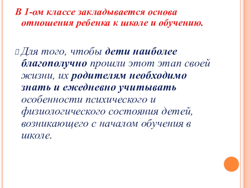 Для того, чтобы дети наиболее благополучно прошли этот этап своей жизни, их родителям необходимо знать и ежедневно учитывать особенности психического и физиологического состояния детей, возникающего с началом обучения в школе.