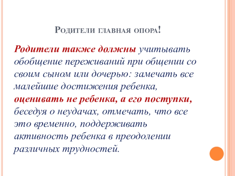 своим сыном или дочерью: замечать все малейшие достижения ребенка, оценивать не ребенка, а его поступки, беседуя о неудачах, отмечать, что все это временно, поддерживать активность ребенка в преодолении различных трудностей.