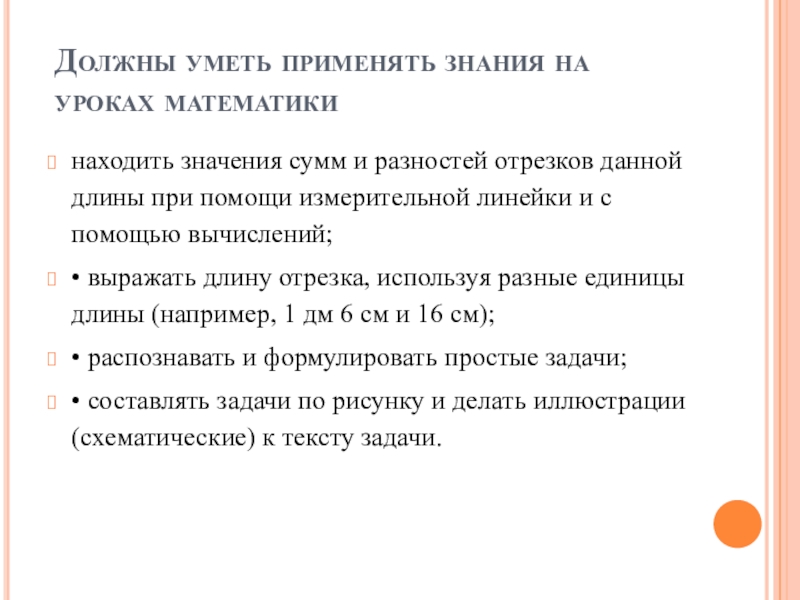 • выражать длину отрезка, используя разные единицы длины (например, 1 дм 6 см и 16 см);