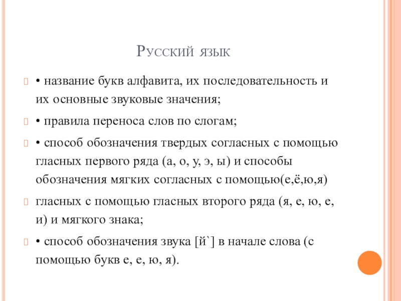 • способ обозначения твердых согласных с помощью гласных первого ряда (а, о, у, э, ы) и способы обозначения мягких согласных с помощью(е,ё,ю,я)