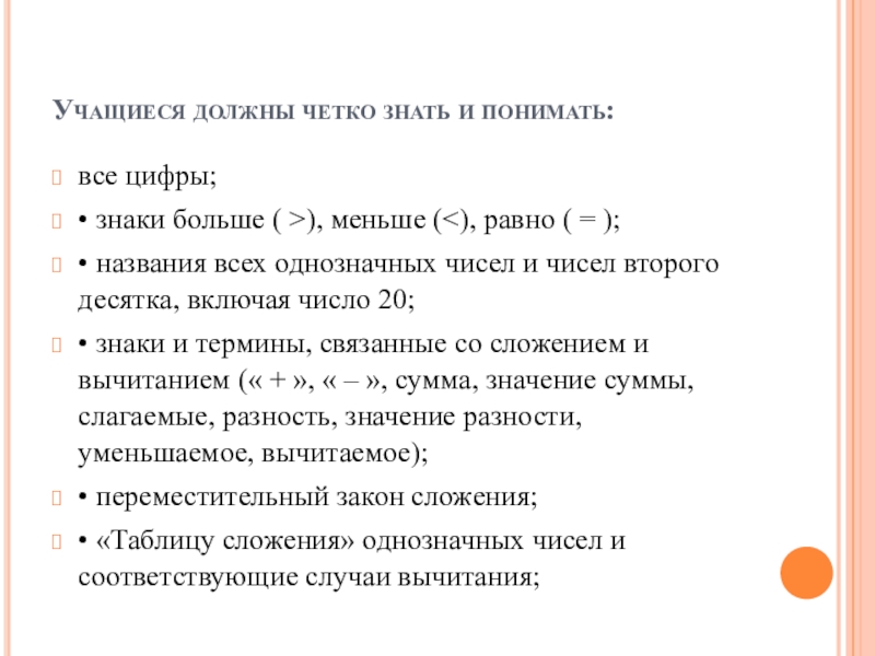 • знаки и термины, связанные со сложением и вычитанием (« + », « – », сумма, значение суммы, слагаемые, разность, значение разности, уменьшаемое, вычитаемое);