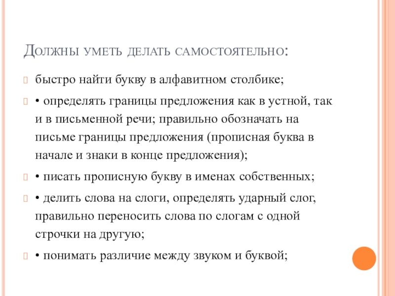 • делить слова на слоги, определять ударный слог, правильно переносить слова по слогам с одной строчки на другую;