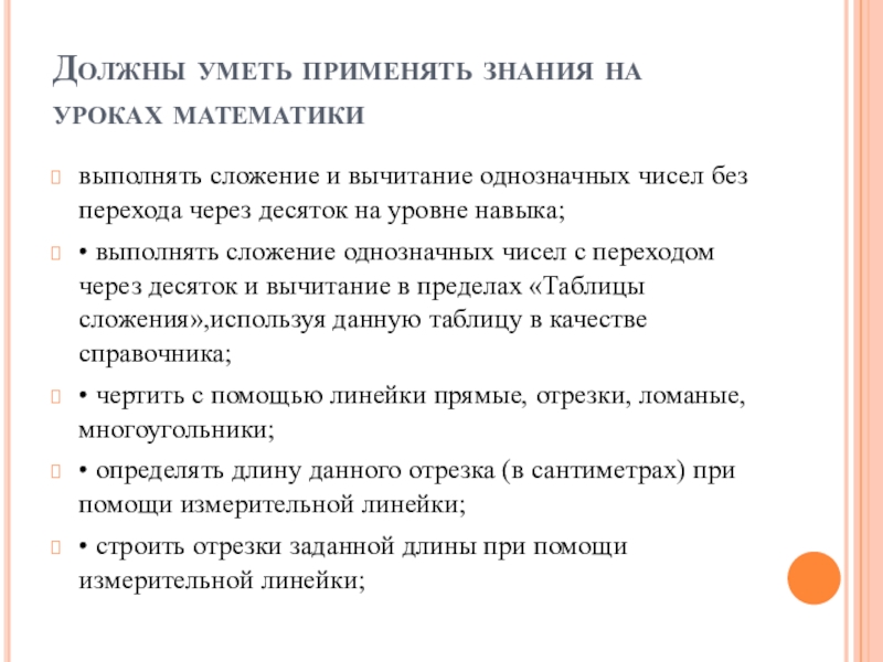 • выполнять сложение однозначных чисел с переходом через десяток и вычитание в пределах «Таблицы сложения»,используя данную таблицу в качестве справочника;