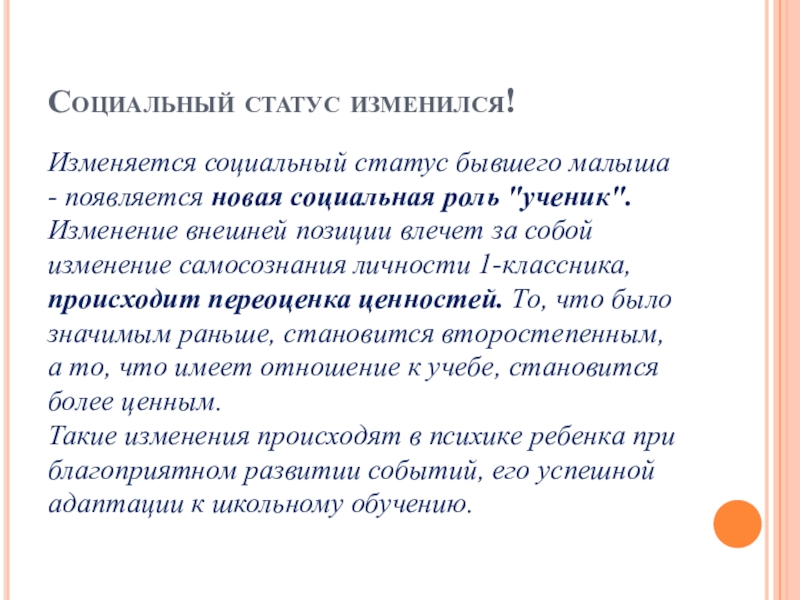Изменение внешней позиции влечет за собой изменение самосознания личности 1-классника, происходит переоценка ценностей. То, что было значимым раньше, становится второстепенным, а то, что имеет отношение к учебе, становится более ценным.