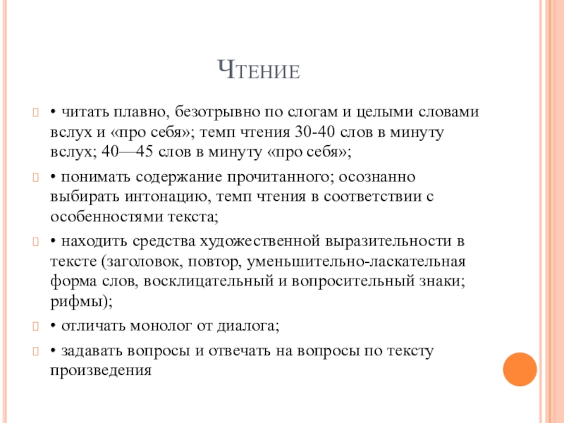 «про себя»; темп чтения 30-40 слов в минуту вслух; 40—45 слов в минуту «про себя»;
