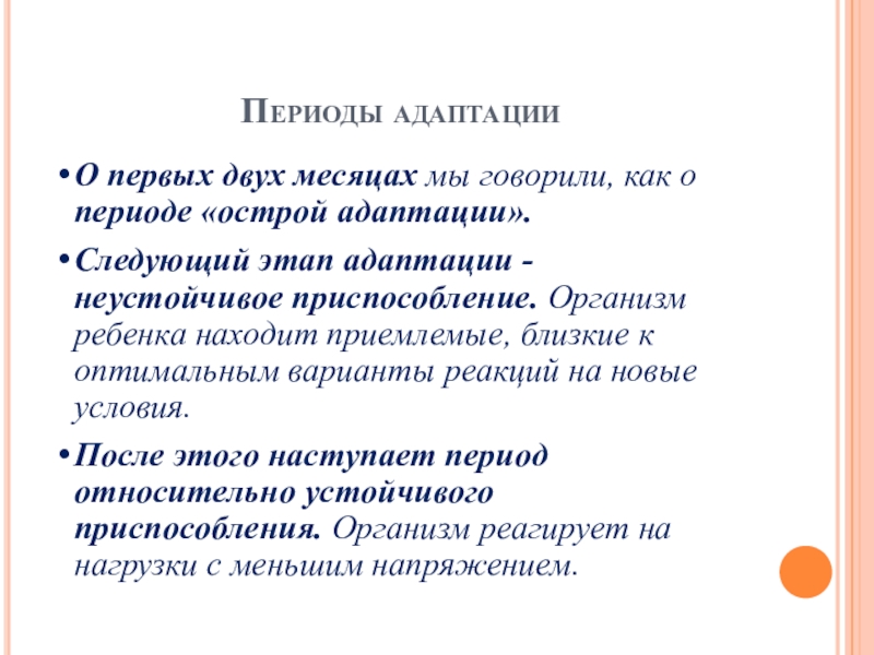 Следующий этап адаптации - неустойчивое приспособление. Организм ребенка находит приемлемые, близкие к оптимальным варианты реакций на новые условия.