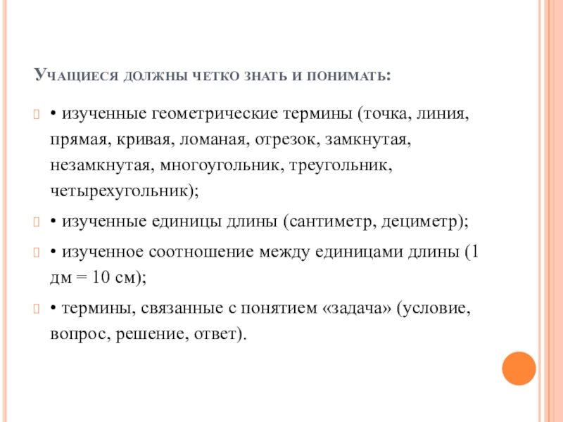 • о линиях: прямой, кривой, ломаной, отрезке, дуге;