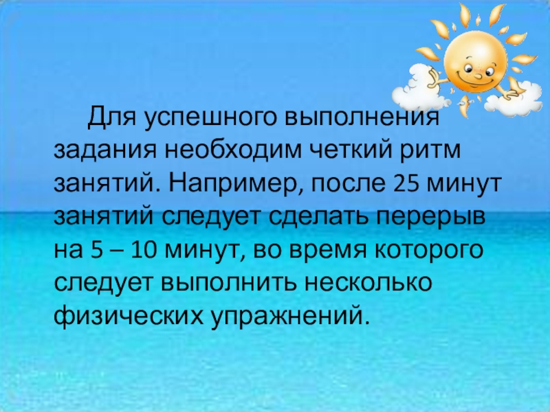 Слайд 7 Для успешного выполнения задания необходим четкий ритм занятий. Например, после 25