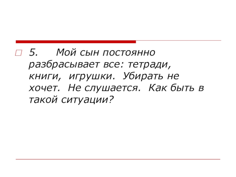 5. Мой сын постоянно разбрасывает все: тетради, книги, игрушки. Убирать не хочет. Не слушается. Как быть