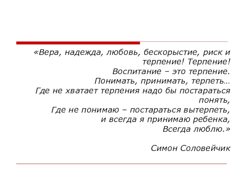 Слайд 3«Вера, надежда, любовь, бескорыстие, риск и терпение! Терпение!