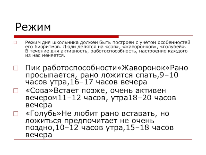 биоритмов. Люди делятся на «сов», «жаворонков», «голубей». В течение дня активность, работоспособность, настроение каждого из нас меняется.