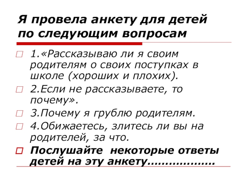 Слайд 10Я провела анкету для детей по следующим вопросам