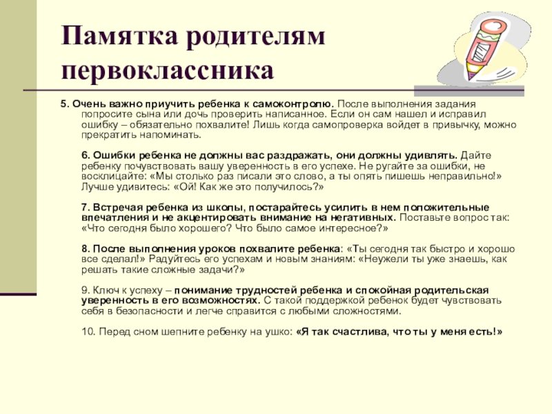 задания попросите сына или дочь проверить написанное. Если он сам нашел и исправил ошибку – обязательно похвалите! Лишь когда самопроверка войдет в привычку, можно прекратить напоминать.