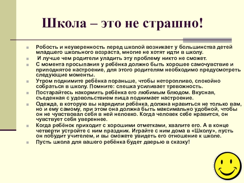 Утром поднимите ребёнка пораньше, чтобы неторопливо, спокойно собраться в школу. Помните: спешка усиливает тревожность.