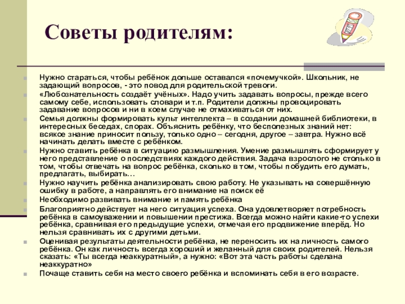 «Любознательность создаёт учёных». Надо учить задавать вопросы, прежде всего самому себе, использовать словари и т.п. Родители должны провоцировать задавание вопросов и ни в коем случае не отмахиваться от них.