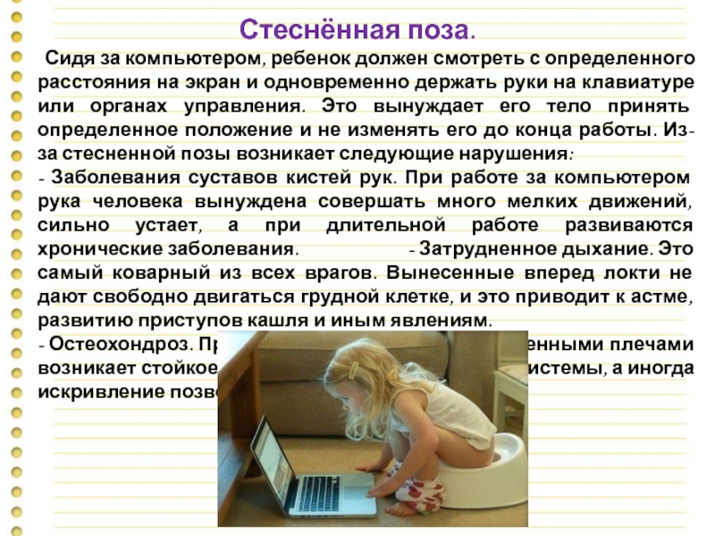 Сидя за компьютером, ребенок должен смотреть с определенного расстояния на экран и одновременно держать руки на клавиатуре или органах управления. Это вынуждает его тело принять определенное положение и не изменять его до конца работы. Из-за стесненной позы возникает следующие нарушения: