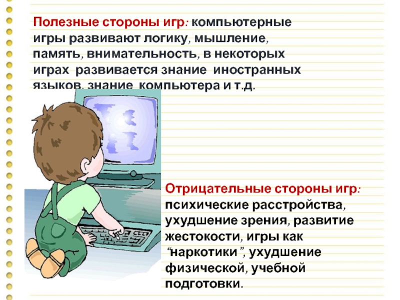 Отрицательные стороны игр: психические расстройства, ухудшение зрения, развитие жестокости, игры как “наркотики”, ухудшение физической, учебной подготовки.